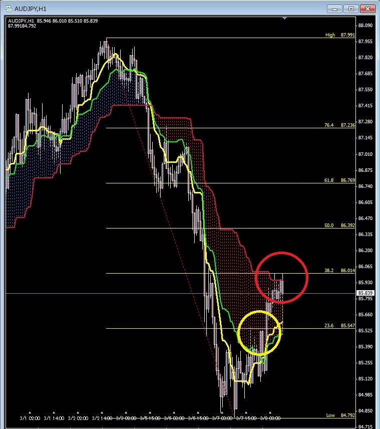 その後、為替レートの動きを見ながらローソク足の終値がフィボナッチ指数38.2%や一目均衡表の雲の上限を突き抜けてきたら85.50円に入れたストップ注文を為替レートの動きに合わせて上げていく戦略が有効になります。